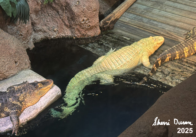 Leaving the dolphins, we go through a hallway of insects which leads us to the Gator Crossing. Kell talks about the differences between alligators and crocodiles, their habitat and how their teeth are structured. I do not think I want to meet up with either a gator or croc. They have three albinos which they got from St Augustine. We are able to look down onto a number of fish as well. I do not know what they are.